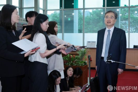[서울=뉴스핌] 이길동 기자 = 조현 외교부 장관이 21일 서울 종로구 외교부 청사로 첫 출근하며 취재진의 질문에 답하고 있다. 2025.07.21gdlee@newspim.com