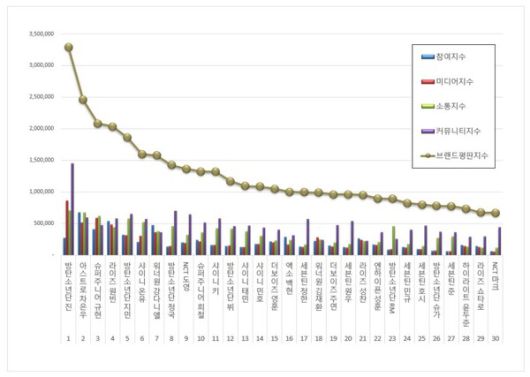 2위, 방탄소년단 진 브랜드는 참여지수 273,164 미디어지수 567,622 소통지수 1,950,361 커뮤니티지수 2,000,223이 되면서 브랜드평판지수 4,791,370으로 분석됐다. 지난 6월 브랜드평판지수 3,221,688과 비교해보면 48.72% 상승했다.