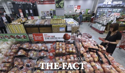 폭염에 이은 폭우 피해로 서민들의 먹거리 물가에 또 비상이 걸렸다. 서울 시내 한 대형마트 매대에 과일이 진열돼 있는 모습. /뉴시스 |