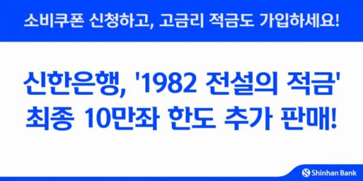 신한은행은 고금리 상품을 통한 고객의 소비 여력 확보를 돕고자 '민생회복 소비 쿠폰' 신청 시작일에 맞춰 1982 전설의 적금 추가 판매를 결정했다고 밝혔다.