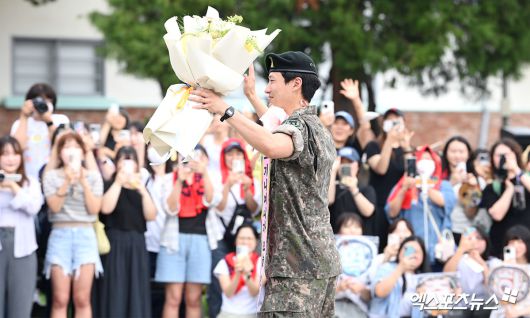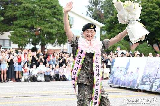 21일 오전 서울 노원구 육군사관학교 앞에서 진행된 전역식 현장에는 이른 아침부터 팬들과 취재진이 모여 우즈의 전역을 축하하며 복귀를 반겼다.
