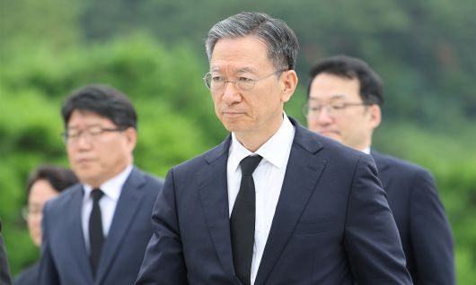 정성호 신임 법무부 장관이 21일 서울 동작구 국립서울현충원 현충탑에 참배하기 위해 이동하고 있다. 뉴시스 |