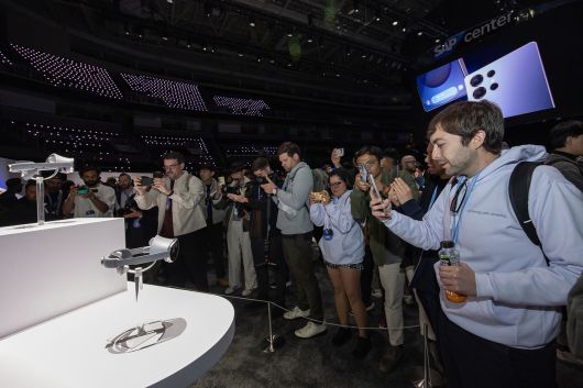 ‘갤럭시 언팩 2025’에서 관람객이 XR 기기 ‘프로젝트 무한’의 디자인을 관람하는 모습 |