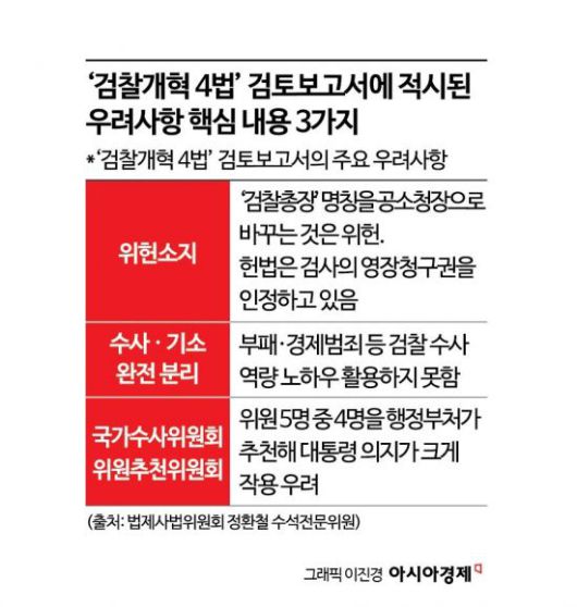 범여권을 중심으로 검찰개혁 움직임이 속도를 내면서 검찰개혁 4법에 대한 우려의 목소리도 커지고 있다. 앞서 법사위 전문위원은 검찰청법 폐지법, 공소청 설치법, 중수청 설치법에 대한 검토 보고서에서 "검찰의 수사 권한을 분리해 다른 기관에 부여하면 수사와 기소의 공정성, 객관성 확보 및 각종 권한의 합리적 행사를 기대할 수 있다"면서도 "검찰이 장기간 축적해온 수사 역량이나 노하우를 충분히 활용하지 못해 부패·경제범죄 등에 대한 효과적 대응에 어려움이 발생할 가능성도 함께 고려해야 한다"고 지적했다.