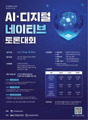 (서울=연합뉴스) 조성미 기자 = 과학기술정보통신부는 중·고·대학(원)생을 대상으로 'AI·디지털 네이티브 토론 대회'와 'AI·디지털 논문 공모전'을 연다고 21일 밝혔다.