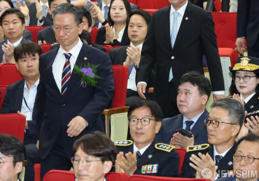 [과천=뉴스핌] 김학선 기자 = 정성호 법무부 장관이 21일 경기도 과천시 정부과천청사에서 열린 취임식에 입장하는 가운데 김현우 서울구치소장(오른쪽)이 박수치고 있다. 2025.07.21 yooksa@newspim.com