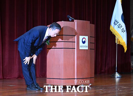 [더팩트|과천=박헌우 기자] 정성호 법무부 장관이 21일 오전 경기 과천시 정부과천청사에서 열린 제71대 법무부 장관 취임식에 참석해 인사하고 있다.