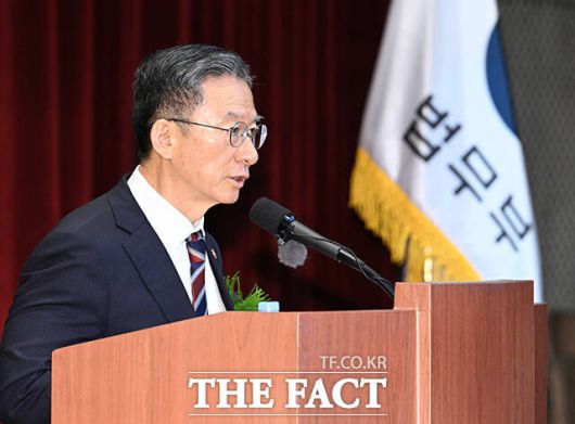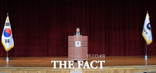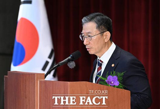 [더팩트|과천=박헌우 기자] 정성호 법무부 장관이 21일 오전 경기 과천시 정부과천청사에서 열린 제71대 법무부 장관 취임식에 참석해 취임사를 하고 있다.