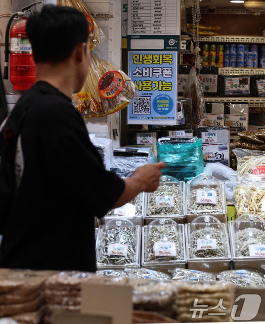 (서울=뉴스1) 구윤성 기자 = 민생회복 소비쿠폰 1차 신청 첫 날인 21일 서울의 한 전통시장에 쿠폰 사용 관련 포스터가 붙어 있다. 2025.7.21/뉴스1kysplanet@news1.krCopyright ⓒ 뉴스1. All rights reserved. 무단 전재 및 재배포, AI학습 이용 금지.