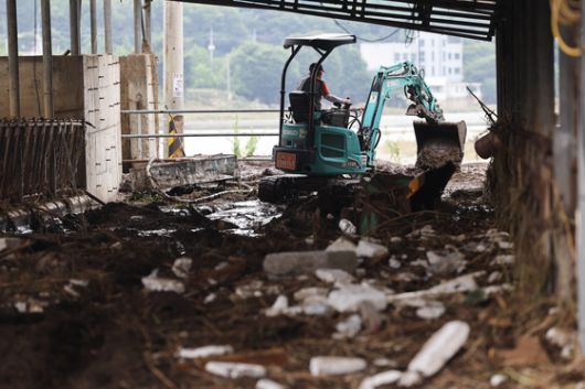 21일 경기도 가평군 수해현장에서 피해를 입은 한 농가 직원들이 복구작업을 하고 있다. 전민규 기자 |