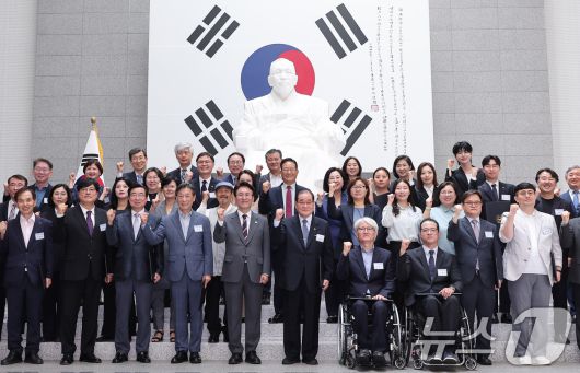 (서울=뉴스1) 김성진 기자 = 김민석 국무총리가 21일 서울 용산구 백범김구기념관에서 열린 광복 80주년 기념사업 추진위원회 출범식에서 참석자들과 기념촬영을 하고 있다. 2025.7.21/뉴스1ssaji@news1.krCopyright ⓒ 뉴스1. All rights reserved. 무단 전재 및 재배포, AI학습 이용 금지.