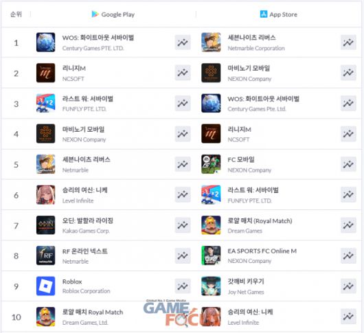 구글 플레이에서는 '화이트아웃 서바이벌', '리니지M', '라스트 워: 서바이벌', '마비노기 모바일', '세븐나이츠 리버스' 등 지난 주 상위권을 기록한 게임들이 TOP 5를 유지하고 있다. '마비노기 모바일'과 '세븐나이츠 리버스' 등 비교적 최근 서비스를 시작한 게임들이 장기 순항 단계에 접어든 모습이다.