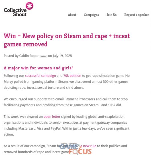 콜렉티브 샤우트는 홈페이지를 통해 비자와 마스터카드 등 카드사 및 결제 처리 업체에 이메일 서한을 보내는 캠페인을 전개했으며, 이를 통해 '스팀'에 새로운 정책이 도입돼 수백 개의 강간, 근친상간 게임이 삭제됐다고 주장했다.