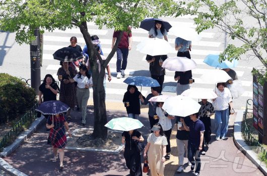 찜통더위가 이어지고 있는 3일 광주 북구청 교차로에 구청 공직자들이 점심시간 양산을 쓰고 이동하고 있다. (광주 북구 제공. 재판매 및 DB 금지) 2025.7.3/뉴스1 ⓒ News1 박지현 기자 |