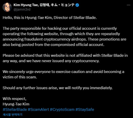시프트업 '스텔라 블레이드' 공식 X 계정이 암호화폐 단체로 추정되는 세력에게 해킹됐다. 김형태 시프트업 대표는 금융 사기 피해자가 되지 않도록 각별히 주의할 것을 당부했다.