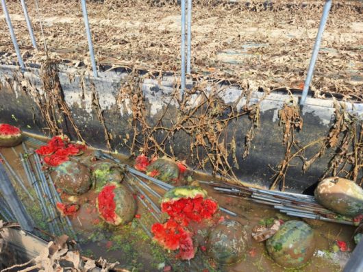 32℃를 웃도는 한증막 날씨 속에서 비닐하우스 내부는 각종 먼지로 뒤덮이며 금방 뿌얘졌다. 과일들은 손을 쓸 수 없을 정도로 물러터져서 바닥에 버려져 있었다. 진흙 때문에 장화가 깊숙이 빠져서 이동도 쉽지 않았다.