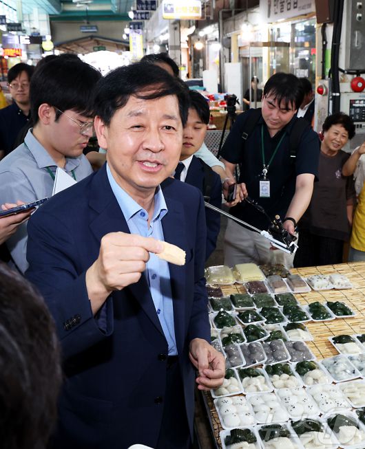 (세종=뉴스1) 김기남 기자 = 구윤철 경제부총리 겸 기획재정부 장관이 21일 오후 민생회복 소비쿠폰 시행 첫날 충남 공주시 산성시장을 방문 떡집을 방문하여 인절미를 시식하며 시민들과 이야기를 나누고 있다. 2025.7.21/뉴스1kinam@news1.krCopyright ⓒ 뉴스1. All rights reserved. 무단 전재 및 재배포, AI학습 이용 금지.