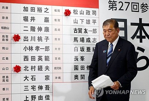 이시바 시게루 일본 총리가 20일 자민당 본부에서 참의원(상원) 선거 관련 기자회견을 한 이후 퇴장하고 있다. 〈사진=AFP 연합뉴스〉 |