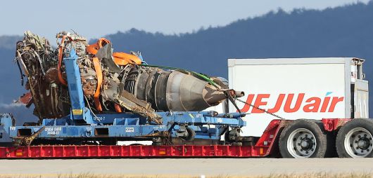 지난 1월 4일 전남 무안국제공항 참사 현장에서 로컬라이저(방위각 시설) 둔덕에 파묻혀 있던 제주항공 7C2216편의 엔진이 트럭에 실려 이동하고 있다./뉴스1 |