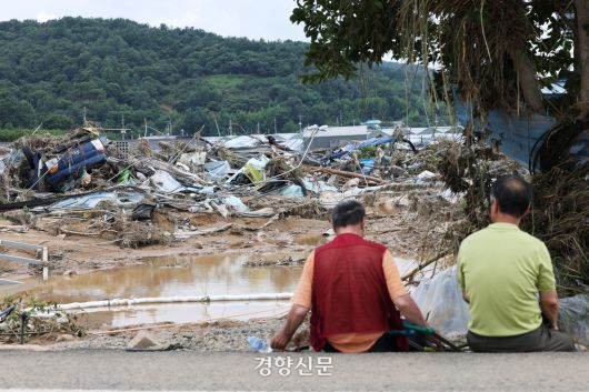 21일 경남 산청군 신안면 청현마을 주민들이 폭우로 폐허가 된 마을을 바라보고 있다. 한수빈 기자 |