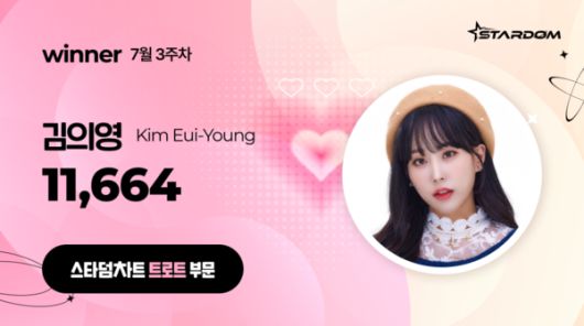 김의영은 7월 3주차(집계기간 7월 14일~7월 20일) '스타덤 차트' 트로트 부문 주간랭킹에서 1위를 차지했다. 7월 2주차 1위에 이어 2주 연속 정상 등극이다.