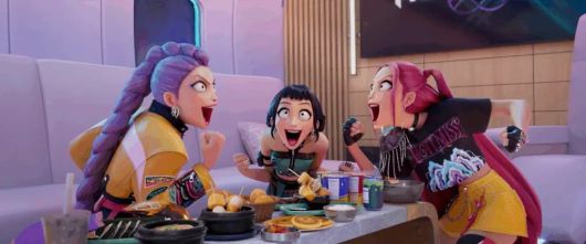 역대급 신드롬을 일으키고 있는 넷플릭스 오리지널 애니메이션 영화 ‘케이팝 데몬 헌터스’. 걸그룹 헌트릭스(HUNTR/X)의 K-푸드 폭풍 먹방 신으로 오프닝을 열었다. @netflix |