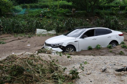 21일 경기도 가평군 대보교 인근 수해 현장에서 차량이 파손되어 있다. 연합뉴스 |