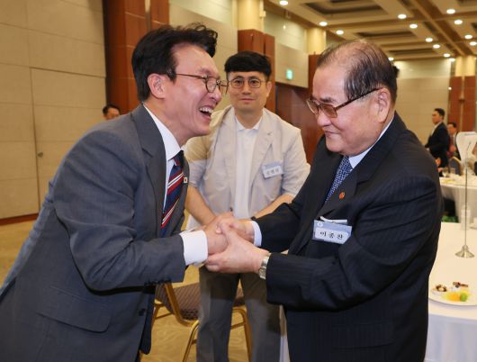 김민석 국무총리가 21일 서울 용산구 백범김구기념관에서 열린 광복 80년 기념사업추진위 출범식에 참석해 이종찬 광복회장과 인사를 나누고 있다. 연합뉴스 |