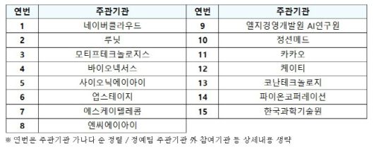 15개 정예팀 주관기관으로는 △네이버클라우드 △루닛 △모티프테크놀로지스 △바이오넥서스 △사이오닉에이아이 △업스테이지 △에스케이텔레콤 △엔씨에이아이 △엘지경영개발원 AI연구원 △정션메드 △카카오 △케이티 △ 코난테크놀로지 △파이온코퍼레이션 △한국과학기술원 등이다.