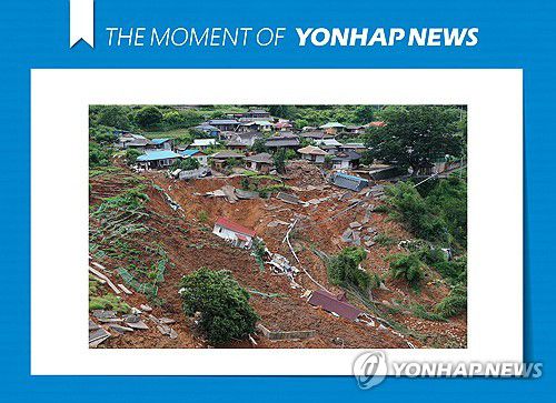 일부 주택은 흙과 잔해 위에 눕혀지고, 일부는 완전히 매몰돼 지붕만 보이는 등 마을 기능이 마비된 모습이다. 2025.7.21 [THE MOMENT OF YONHAPNEWS]