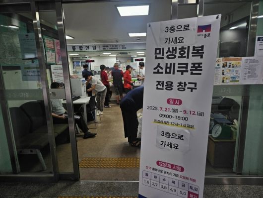 박모씨(64)는 "온라인은 너무 어렵고 복잡해서 오프라인 신청을 하려고 문 열자마자 바로 주민센터에서 줄을 섰다"며 "식료품을 사는 데 (소비쿠폰이) 도움이 될 것 같다"고 말했다. 종로구의 한 주민센터도 상황이 비슷했다. 점심시간이 가까워질수록 인파가 더 몰렸다. 부모를 대신해 대리 신청에 나선 자녀들도 눈에 띄었다.