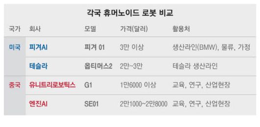 특히 중국 기업들이 가격경쟁력을 앞세운 로봇을 만들고 있는 만큼 저렴한 가격이 경쟁에서 중요한 요소가 될 것으로 보인다. 중국 휴머노이드 로봇으로는 유니트리로보틱스의 'G1', 엔진AI의 'SE01' 등이 있다. G1은 1만6000달러(약 2180만원), SE01은 2만1000~2만8000달러(약 2870만~3820만원)다.