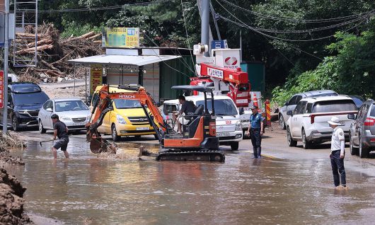 중장비 동원 정비 21일 경기 가평군 상면에서 재난 당국 관계자들이 포클레인 등 중장비를 동원해 침수된 마을 진입로를 정비하고 있다. 가평에선 20일 새벽 시간당 80㎜의 폭우가 쏟아졌다. 가평=남정탁 기자 |