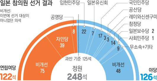 자민·공명당은 이번 선거에서 50명 이상을 당선시켜야 비개선(투표 대상이 아닌 의석) 75석을 더해 과반(125석)을 차지할 수 있었다. 참의원은 3년마다 정원 248명의 절반을 교체한다. 이번 선거에선 보궐 1명을 더해 125명을 새로 뽑았다.