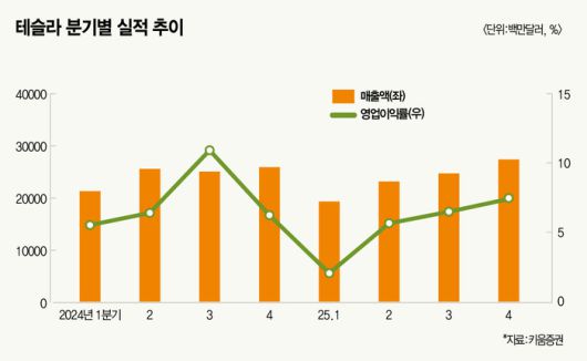 주가 바로미터가 되는 실적도 올해 부진하다. 테슬라는 지난 1분기 매출 193억달러, 영업이익 3억9900만달러, 순이익 4억1000만달러를 기록했다. 전년 동기 대비 매출은 10% 줄었고 영업이익과 순이익은 각각 66%, 71%씩 급감했다. 주당순이익(EPS)도 0.27달러로 1년 전보다 40% 줄며 월가 추정치(0.39달러)에 못 미쳤다.