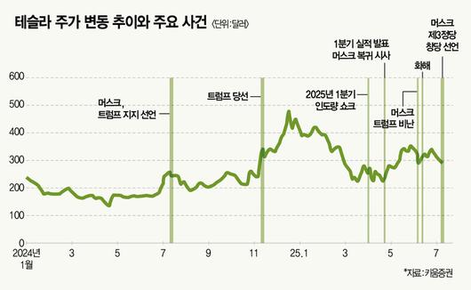 정부효율부(DOGE) 수장으로 미국 정부 핵심 인물 중 하나로 꼽힌 머스크와 트럼프 관계는 파국으로 치달았다. 특히 두 사람 관계가 멀어지며 테슬라 주가는 곤두박질쳤다. 머스크가 트럼프의 감세·재정 정책에 반발하며 신당 창당을 선언한 지난 7월 6일(현지 시간) 테슬라 주가는 하루 사이 7% 급락했다. 앞서 트럼프가 머스크를 향해 정부 보조금을 끊겠다고 으름장을 놓은 지난 6월 5일에도 테슬라 주가는 하루 14% 떨어졌다.