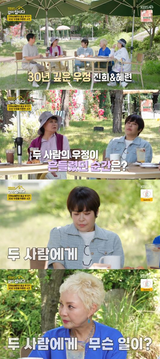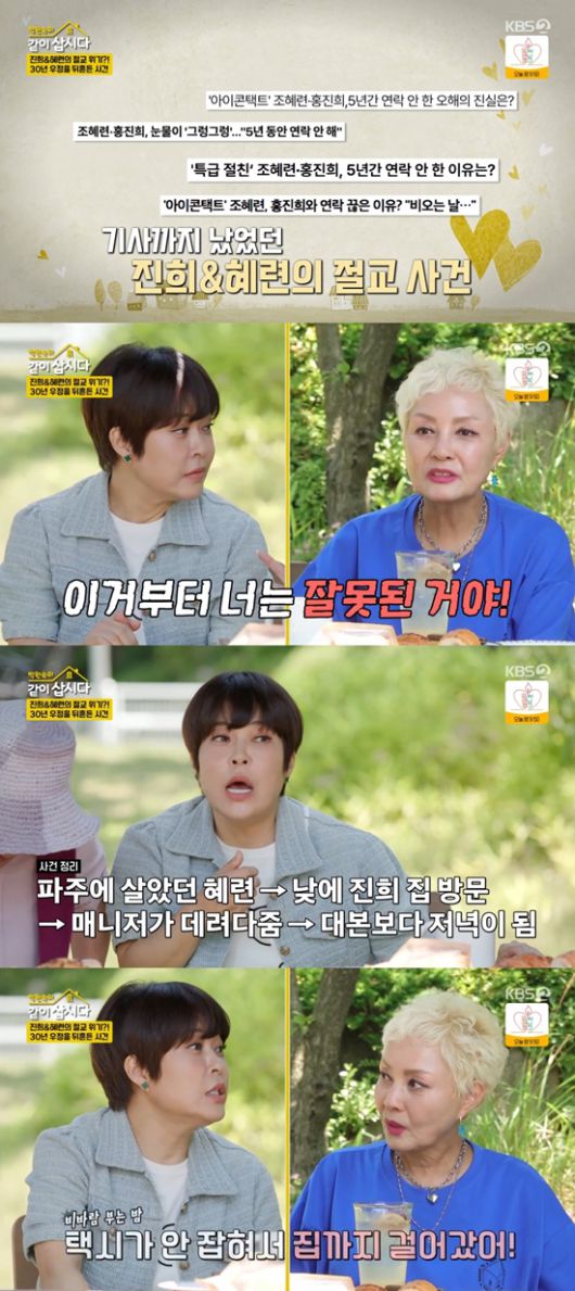 박원숙이 조혜련과 홍진희에게 "30년 동안 지내면서 화나고 슬픈 일은 없었냐?"라고 물었다. 이에 조혜련이 "그거 털고 갑시다"라면서 이야기를 시작했다. 조혜련은 "어느 날 (홍진희와) 연락이 됐는데, 드라마에 들어가게 됐다고 대본량이 장난이 아니라더라. 내가 '언니를 도와줘야겠다' 싶어 집으로 갔다"라고 말했다.