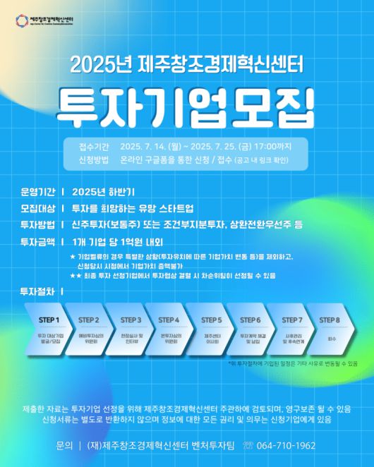 신청은 오는 25일(금) 오후 5시까지 제주창조경제혁신센터 홈페이지에서 가능하며, 최종 투자계약은 9월 중 마무리된다.