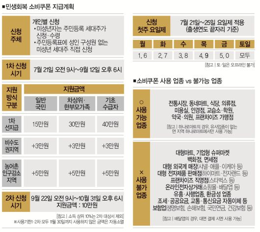 다만, 프랜차이즈 편의점의 경우는 직영점을 제외한 연 매출액 30억원 이하 가맹점에서는 사용이 가능하다. 정부와 지자체는 소비쿠폰 사용이 가능한 점포에는 이를 식별할 수 있는 스티커를 부착할 예정이다.