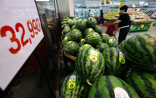 21일 서울 시내 한 대형마트 매대에서 수박 한 통이 3만 원을 훌쩍 넘긴 가격에 판매되고 있다. 한국농수산식품유통공사(aT)에 따르면 18일 기준 수박 한 통의 소매 가격은 전년 대비 44.7% 오른 3만866원으로 조사됐다. 올해 7월 초 이례적인 폭염에 이어 기록적인 폭우의 영향으로 농산물 가격이 급등하고 있다.