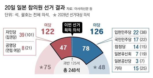 21일 공영 NHK방송에 따르면 전날 치러진 참의원 선거에서 자민당은 39석, 공명당은 8석을 확보하는 데 그쳤다. 이시바 총리는 연립여당의 목표 의석을 50석으로 제시했지만 3석이 모자란 것. 연립여당의 참의원 의석수는 기존 의석(75석)을 합해 122석이 돼 과반(125석) 확보에 실패했다. 참의원 선거는 전체 248명의 절반인 124명을 3년마다 뽑는다. 올해는 결원 1명을 포함해 125명이 선출됐다. ‘일본인 퍼스트’를 앞세운 강경 보수 참정당은 기존 2석에서 15석으로 약진했다.