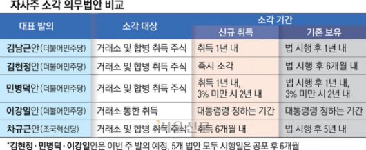 이번 주 발의 예정인 민병덕 의원안도 취득 후 ‘1년 이내 소각’을 원칙으로 하고 자사주 비율이 3% 미만인 경우에만 ‘2년 내 소각’을 할 수 있게 했다. 이강일 의원안은 소각 기간을 법률에 명시하지 않고 ‘대통령령으로 정하는 기간’으로 뒀다.