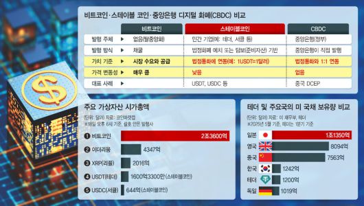 스테이블코인은 이름에서도 알 수 있듯 법정화폐의 가치와 연동시켜 ‘가격 안정성’을 유지하도록 한 암호화폐다. 가상자산 대장주로 여겨지는 비트코인은 물론 이더리움 등 알트코인들은 하루에도 가격이 크게 오르내리는 등 변동성이 크다. 반면, 스테이블코인은 예컨대 ‘1코인=1달러’ 라는 비율이 유지된다는 특징이 있다. 현재 시장에서는 USDT·USDC 등 미국 달러화에 연동된 스테이블코인 비중이 99% 이상으로 압도적이다.