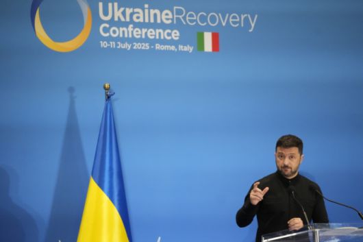 볼로디미르 젤렌스키 우크라이나 대통령이 10일(현지 시간) 이탈리아 로마의 라 누볼라 컨벤션 센터에서 열린 우크라이나 재건 회의(URC)에서 기자회견하고 있다. /AP=뉴시스 |