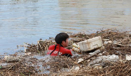▲ 쓰레기로 뒤덮인 목포항서 수거작업하는 해경