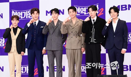 가수 박서진-진해성-에녹-신승태-최수호-강문경이 12일 오후 서울 마포구 누리꿈스퀘어에서 열린 MBN '현역가왕2' TOP7 기자간담회에서 포즈를 취하고 있다. [사진=정소희 기자] |