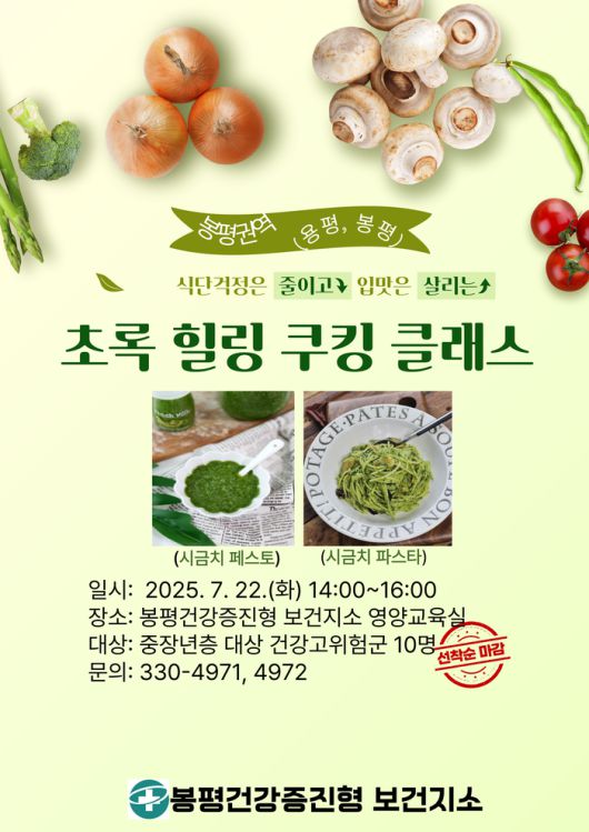 [스포츠서울ㅣ김기원기자]평창군보건의료원은 22일 봉평건강증진형 보건지소 영양교육실에서 봉평권역(용평·봉평) 중장년층을 대상으로 ‘초록 힐링 쿠킹 클래스’를 운영한다.