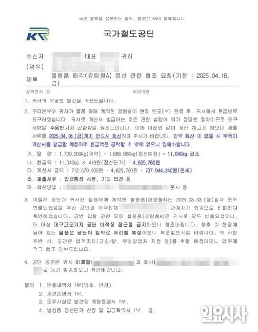 [일요시사 취재1팀] 안예리 기자 = 국가철도공단이 고철 매각 과정에서 민간업체와 갈등을 빚고 있다. 공단은 계약한 고철 1700톤 외에 추가 반출된 물량이 있다며 정산을 요구했지만, 집계 과정에 오류가 발견되면서 이를 철회했다. 그러나 민간업체는 계약 물량 중 일부를 공단 용역업체가 훔쳐갔다며 도난 피해를 주장하고, 공단의 책임 있는 대응을 요구하고 있다.