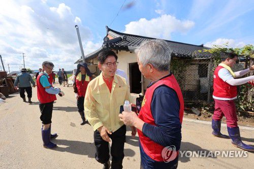 (예산=연합뉴스) 김준범 기자 = 국민의힘 당대표 출마를 선언한 김문수 전 고용노동부 장관이 22일 충남 예산군 삽교읍 수해 현장을 찾아 당 관계자와 인사하고 있다. 2025.7.22