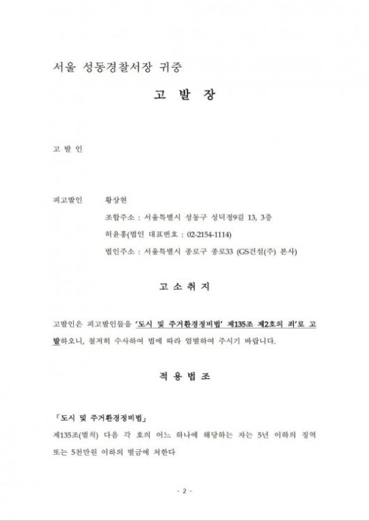 성수1지구 조합원이 조합장과 GS건설을 대상으로 성동경찰서에 제출한 고발장. /사진제공=성수1지구 조합원 |